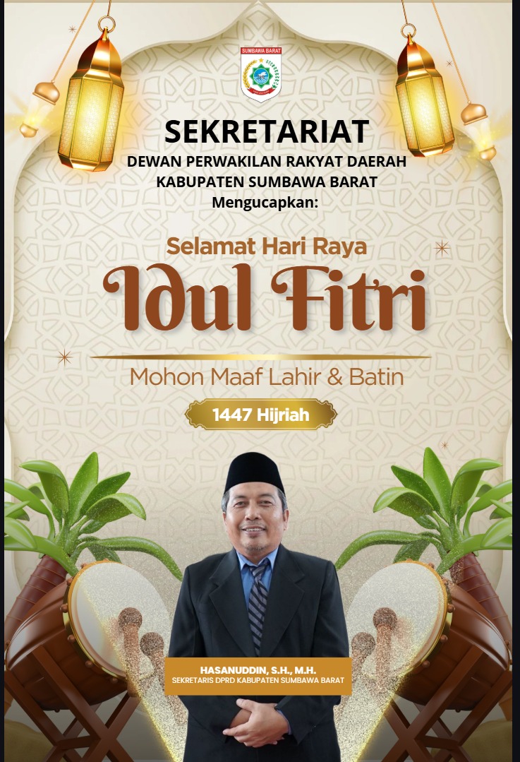 DPRD Iklan Sumbawa Barat Sekretariat Dewan Perwakilan Rakyat Daerah (Setwan) Kabupaten Sumbawa Barat Mengucapkan Selamat Hari Raya Idul Fitri 1 Syawal 1447 H / 2026 M admin 19 Maret 2026 Related Posts:Pimpinan Dan Anggota Dewan Perwakilan Rakyat Daerah…Badan Perencanaan Pembangunan Daerah (Bappeda)…Anggota DPRD (Dapil III) Kabupaten Sumbawa Barat, H…Sekretaris DPD Partai Amanat Nasional (PAN) - Ketua…Keluarga Besar Dinas Komunikasi dan Informatika…Sidang Paripurna DPRD, Bupati KSB Paparkan Pendapat… Post Views: 22 Post navigation Previous: Anggota DPRD (Dapil III) Kabupaten Sumbawa Barat, H Riyadi, SE Mengucapkan Selamat Hari Raya Idul Fitri 1 Syawal 1447 Hijriah – 2026 MasehiNext: Keluarga Besar Dinas Komunikasi dan Informatika (Kominfo) Kabupaten Sumbawa Barat Mengucapkan Selamat Hari Raya Idul Fitri 1447 H / 2026 M Berita Lainnya Pemerintahan Sumbawa Barat Pemda KSB Sosialisasikan Budaya Kerja ASN, Terapkan WFO-WFH admin 16 April 2026 ATRBPN Ekonomi Sumbawa Barat Sosialisasi PTSL di Desa Seloto, Warga Didorong Aktif Daftarkan Tanah admin 14 April 2026 Hukum Polres Sumbawa Barat Sat Samapta Polres Bima Kota Sikat Sabung Ayam, Keresahan Warga Teratasi admin 13 April 2026