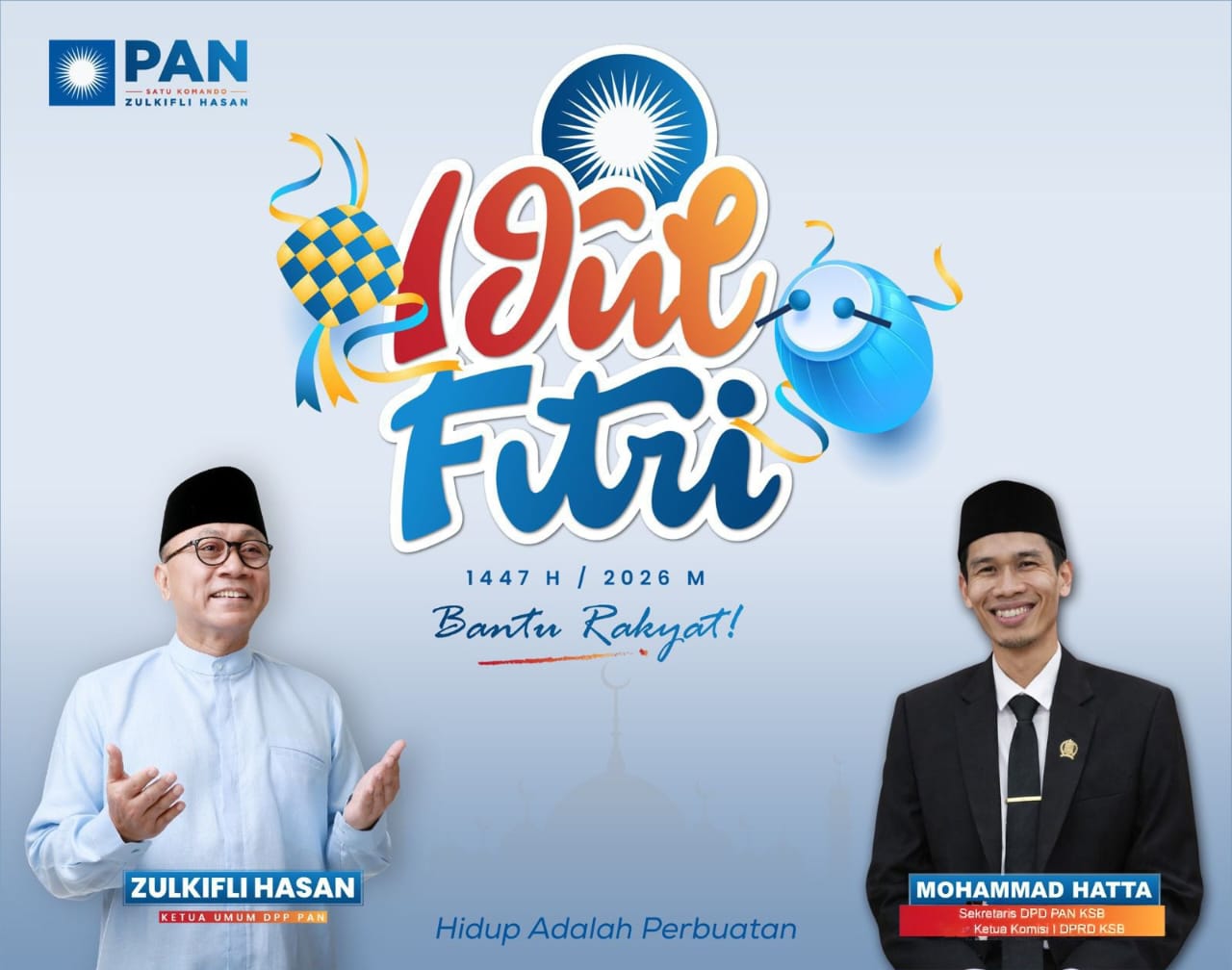 DPD DPRD Iklan Sumbawa Barat Sekretaris DPD Partai Amanat Nasional (PAN) – Ketua Komisi I DPRD Kabupaten Sumbawa Barat, Mohammad Hatta mengucapkan Selamat Hari Raya Idul Fitri 1447 H – 2026 admin 18 Maret 2026 Related Posts:DPW PKB NTB Perkuat Infrastruktur Partai Lewat Monev di KSBBanggar DPRD KSB Dorong Pembahasan SiLPA Tepat TahapanKomisi I DPRD KSB–Bupati Sepakati Usulan 572 Non ASN…Sidang Paripurna DPRD, Bupati KSB Paparkan Pendapat…Anggota DPRD (Dapil III) Kabupaten Sumbawa Barat, H…Pimpinan Dan Anggota Dewan Perwakilan Rakyat Daerah… Post Views: 37 Post navigation Previous: Perjalanan Penerima Beasiswa AMMAN Scholars Menginspirasi Generasi Muda KSBNext: Anggota DPRD (Dapil III) Kabupaten Sumbawa Barat, H Riyadi, SE Mengucapkan Selamat Hari Raya Idul Fitri 1 Syawal 1447 Hijriah – 2026 Masehi Berita Lainnya Pemerintahan Sumbawa Barat Pemda KSB Sosialisasikan Budaya Kerja ASN, Terapkan WFO-WFH admin 16 April 2026 ATRBPN Ekonomi Sumbawa Barat Sosialisasi PTSL di Desa Seloto, Warga Didorong Aktif Daftarkan Tanah admin 14 April 2026 Hukum Polres Sumbawa Barat Sat Samapta Polres Bima Kota Sikat Sabung Ayam, Keresahan Warga Teratasi admin 13 April 2026